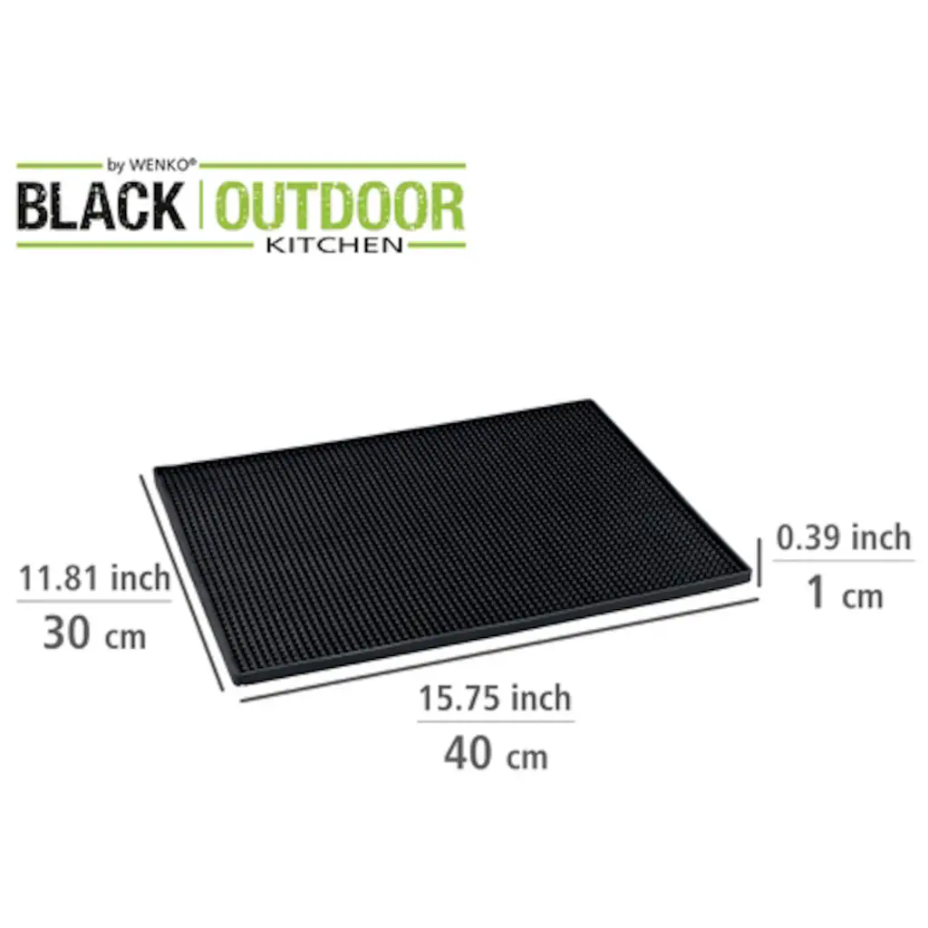 BLACK OUTDOOR KITCHEN by WENKO – das sind die cleveren Produkte, die in Ihrer Outdoorküche für BBQ, Brunch und Grillevent nicht fehlen dürfen. Ein hilfreiches Spül-Zubehör für alle, die eine zusätzliche Abtropffläche benötigen oder bei denen diese am Spülbecken fehlt. Maximaler Nutzen mit einer großzügigen Abmessung von 40 x 30 cm! Hoch funktional und spülmaschinengeeignet Die robuste Abtropfmatte aus Kunststoff sorgt mit ihren zahlreichen Noppen für einen sicheren Halt aller hochwertigen Gläser, Tassen und Teller. Durch die Noppenstruktur kann das überschüssige Spülwasser problemlos ablaufen und das Geschirr trocknet schneller. Die extra große Multifunktionsmatte verhindert unschöne Kratzer auf der Spüle und ist sanft zum Geschirr. Die rutschfeste Matte ist der ideale Helfer bei der Spülarbeit, die Arbeitsfläche wird zuverlässig vor Wasser geschützt und bei Bedarf ist das Pad einfach zu reinigen. Diese clevere Trocken-Matte eignet sich auch ideal zum aufrechten Abtropfen von Schneidebrettern, Gewürzschalen oder Kräutertöpfen der Black Outdoor Kitchen Serie. Während die Utensilien bequem trocknen, können Sie sich gänzlich anderen Dingen widmen. Besonders clever: Zur Reinigung kann die graue Maxi Spülbeckenmatte bei maximal 75° C in der Spülmaschine gereinigt werden. Die Outdoor Kitchen Reihe umfasst tolle Helfer, von denen wir von WENKO überzeugt sind, dass Sie Ihrer Außenküche in Funktion und Optik einen absoluten Mehrwert bieten. Angefangen bei der Zubereitung der Speisen geht es zum einfachen Transport an den Tisch. Von der mühelosen Zubereitung und Vorbereiten der Lebensmittel für den Grill, dem einfachen Transport von Gewürzen, Schalen und Schüsseln, dem ansprechenden Servieren der Speisen, nützlichen Helfern und der angenehmen Reinigung ist alles dabei. Ein besonderer Vorteil: die Auswahl der Artikel der Reihe ergänzen sich wunderbar.