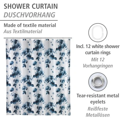 Mit dem Wenko Anti-Schimmel Duschvorhang Rose Bleu sind die Zeiten von angeschimmelten Duschvorhängen vorbei. Zusätzlich ist der schöne und effektive Helfer auch anti-bakteriell beschichtet. Wenko bringt mit diesem Novum Hygiene und Design ins Badezimmer. Natürlich ist dieser Duschvorhang EU-patentiert. Auch in Sachen Optik muss sich der attraktive Vorhang Rose Bleu nicht verstecken. Holen Sie sich die blaue Rosenvielfalt ins heimische Bad. Die beliebte Schönheit zieht alle Blicke auf sich und versprüht gute Laune im Badezimmer. Mit einer Breite von 180 cm eignet sich der ausgefallene Duschvorhang sowohl für Dusche als auch Badewanne. Der hochwertig verarbeitete Duschvorhang ist aus besonders haltbarem Polyester hergestellt. Durch die Oberflächen-Veredelung erhält das Material einen wasserabweisenden Effekt, der zusätzlich für ein einfaches Abperlen von Feuchtigkeit und Wasserspritzer sorgt. Die Feuchtigkeit sammelt sich nicht mehr in den Vorhangfalten. Die Duschvorhänge sind deswegen besonders lange haltbar und trocknen nachweislich schneller. Er ist pflegeleicht und bei 30 °C waschbar. Der obere Saum ist mit einer verstärkten Lochleiste und rostfreien Metallösen versehen. Am unteren Ende ist ein umweltfreundliches Gewichtsband aus Gummi (statt Bleikette) formgebend. Im Lieferumfang sind 12 weiße Duschvorhangringe aus Kunststoff enthalten.
