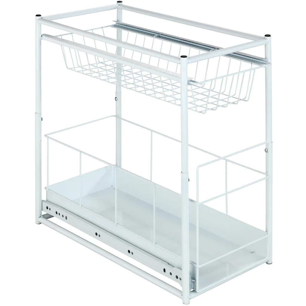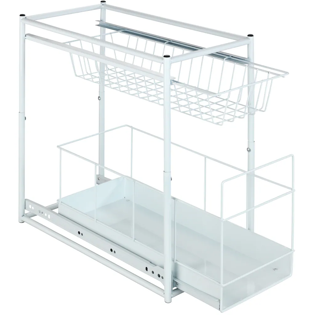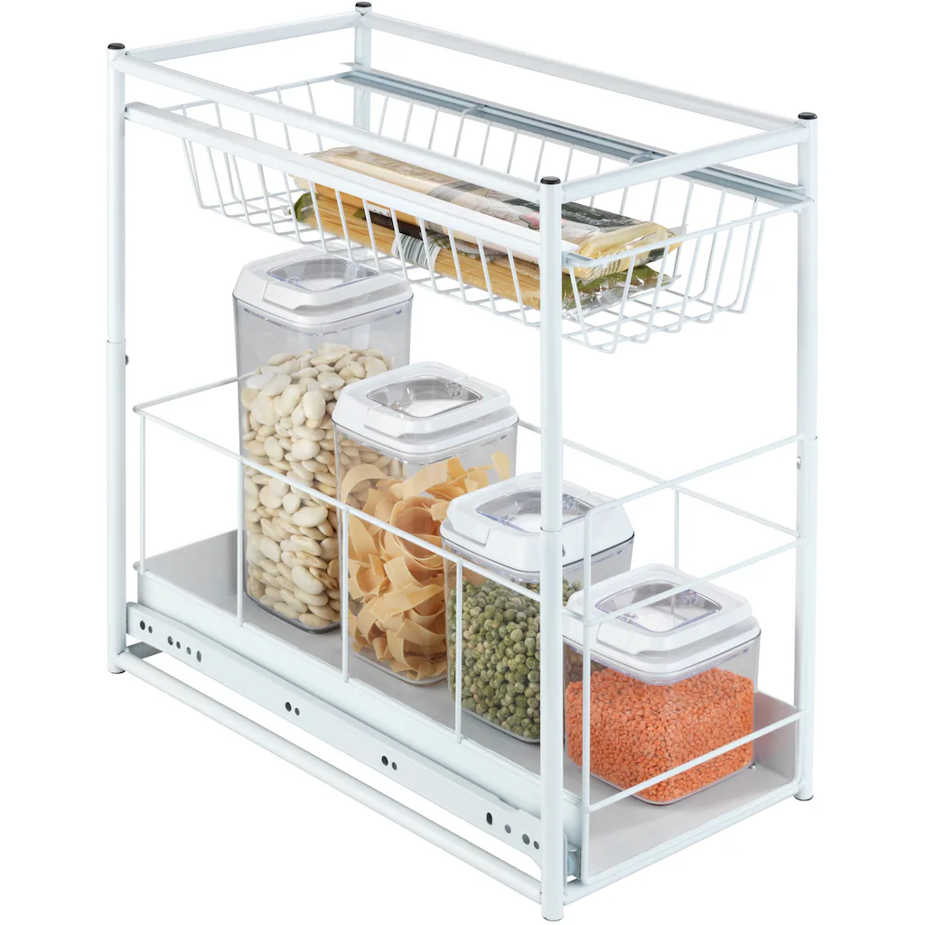 Durch zwei herausziehbare Aufbewahrungskörbe wird Platz für Schwämme, Putzmittel oder Handtücher bereitgestellt. Der Einbau in den Küchenschrank ist einfach und kann schnell erledigt werden. Zur Montage auf dem Schrankboden bestens geeignet. Ein echter Helfer im Küchenchaos.
