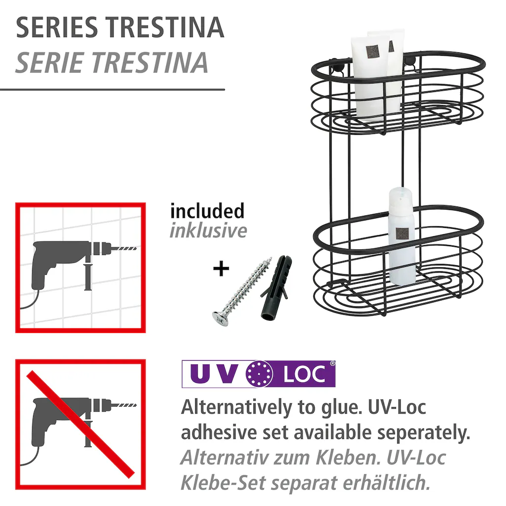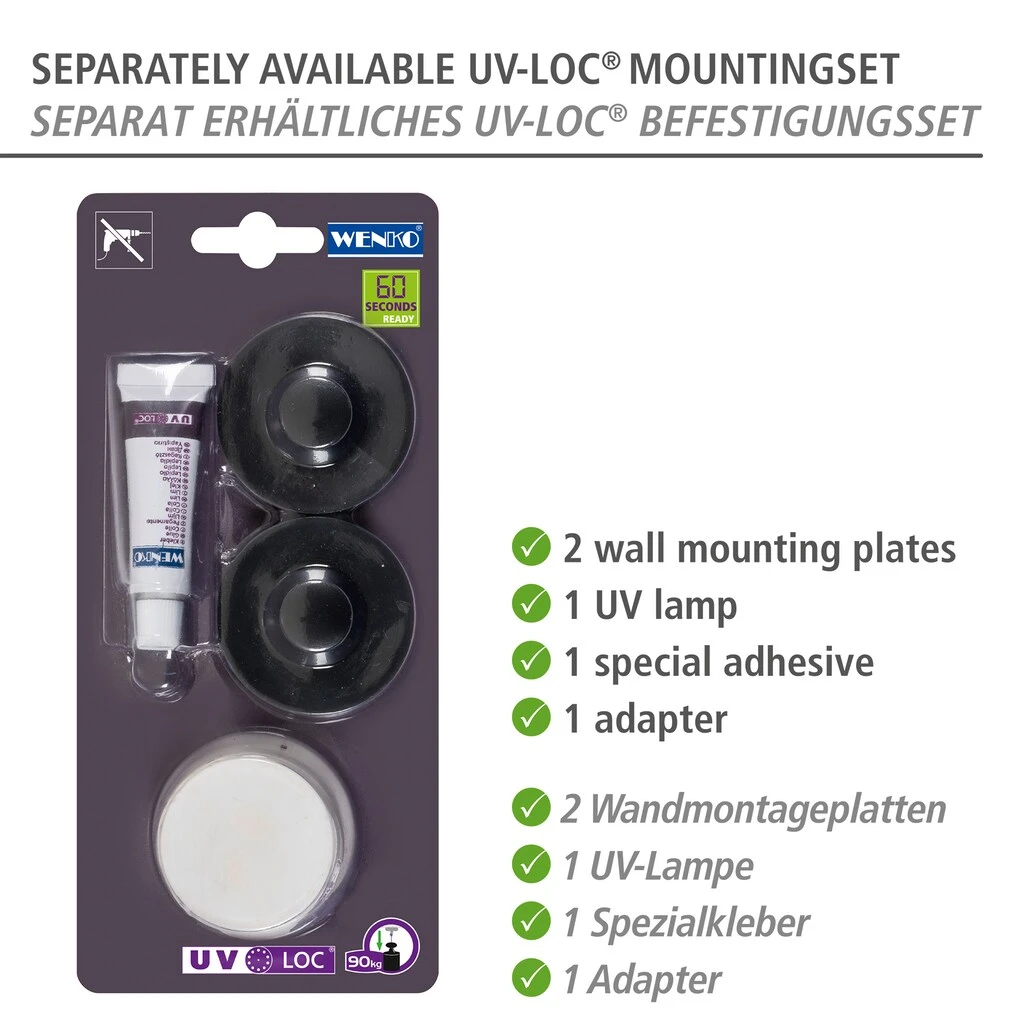 Alternativ kann das Wandregal Trestina mit 2 Etagen auch ohne Bohren befestigt werden – das gelingt Ihnen in Minutenschnelle mit dem innovativen UV-Loc® Klebesystem von WENKO. Mittels Spezialkleber und UV-Lampe bekommen Sie das Bad-Accessoire in nur 60 Sekunden an die Wand. Diese Weltneuheit gewährleistet eine schnelle und saubere Anbringung mit extrem festem und zuverlässigem Halt auf allen tragfähigen Flächen. Das UV-Loc®-Befestigungsset ist separat erhältlich.