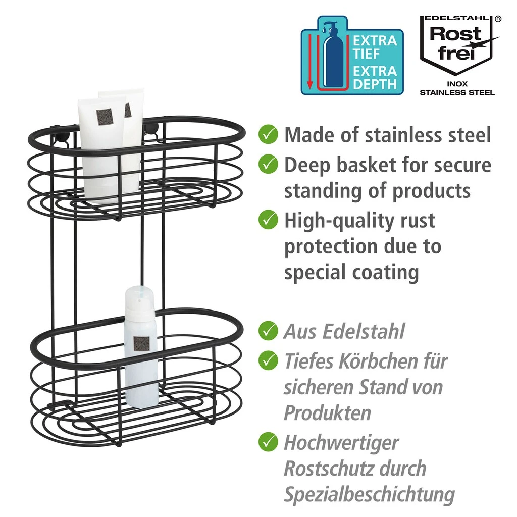 Gefertigt ist das Duschregal aus Edelstahl und verfügt dank innovativer, schwarzer Spezialbeschichtung über einen hochwertigen Rostschutz. Durch die offene Gestaltung in Drahtoptik kann Duschwasser zudem direkt und sauber abfließen.