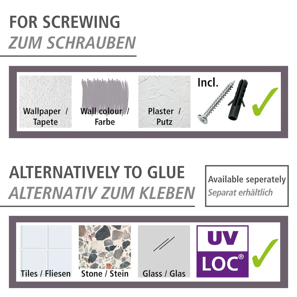 Alternativ kann das Eckregal Trestina mit 2 Etagen auch ohne Bohren befestigt werden – das gelingt Ihnen in Minutenschnelle mit dem innovativen UV-Loc® Klebesystem von WENKO. Mittels Spezialkleber und UV-Lampe bekommen Sie das Bad-Accessoire in nur 60 Sekunden an die Wand. Diese Weltneuheit gewährleistet eine schnelle und saubere Anbringung mit extrem festem und zuverlässigem Halt auf allen tragfähigen Flächen. Das UV-Loc®-Befestigungsset ist separat erhältlich.