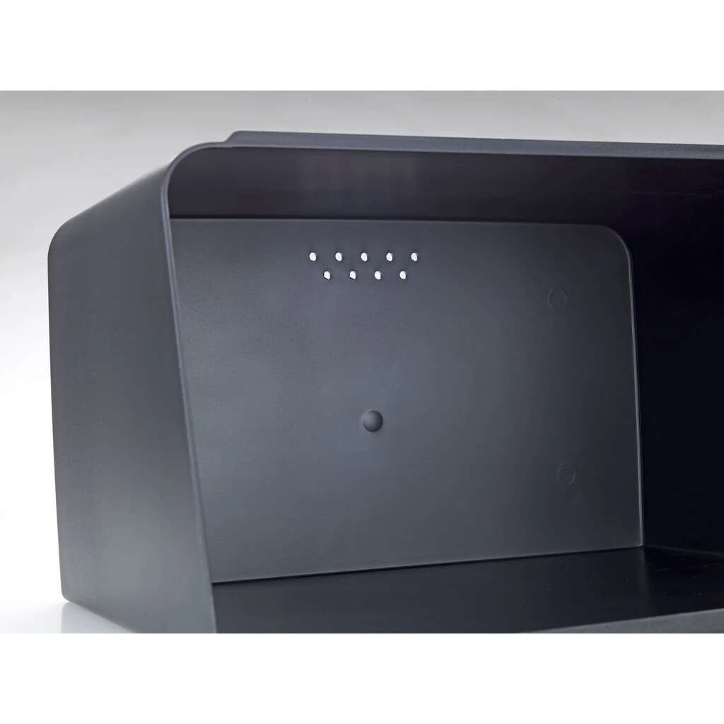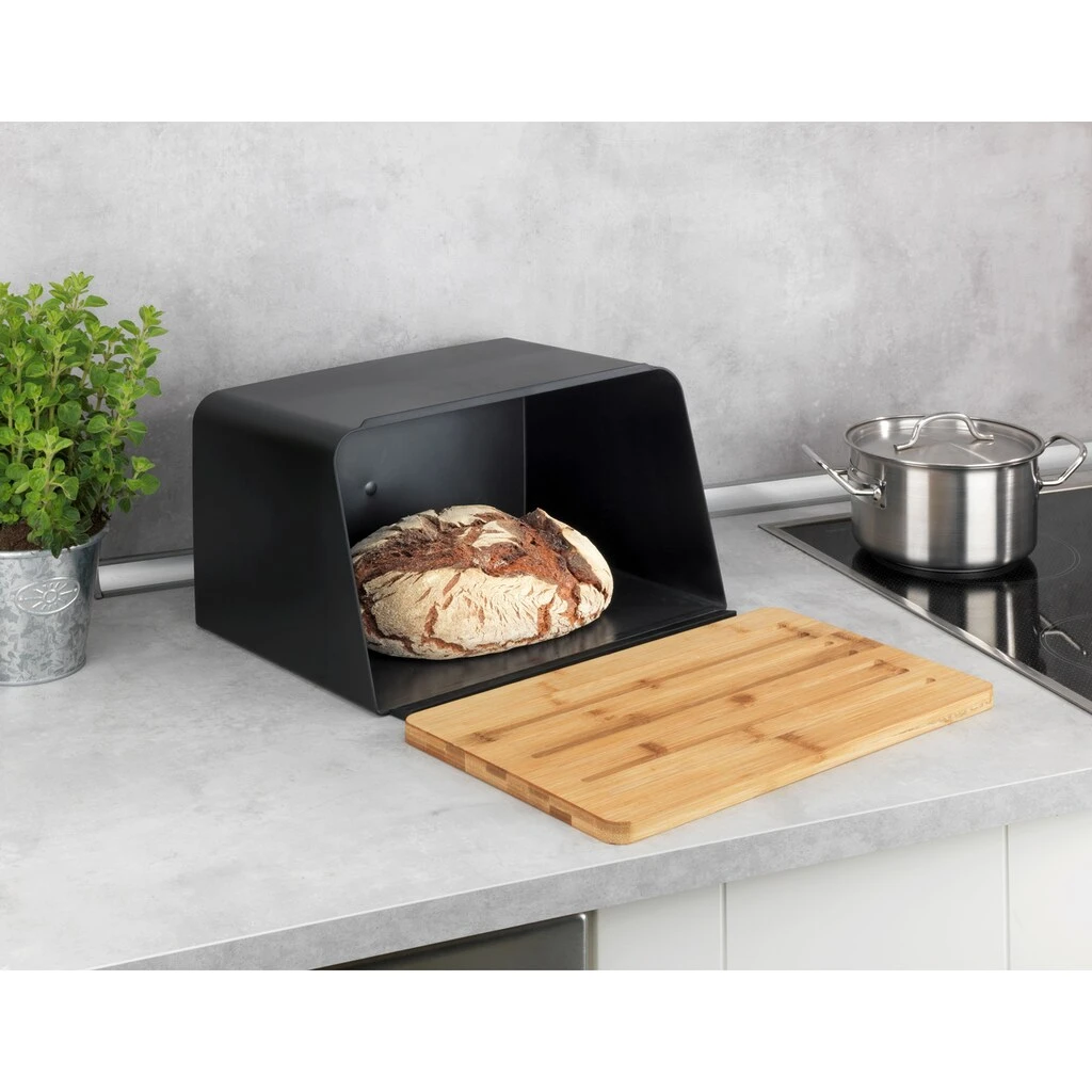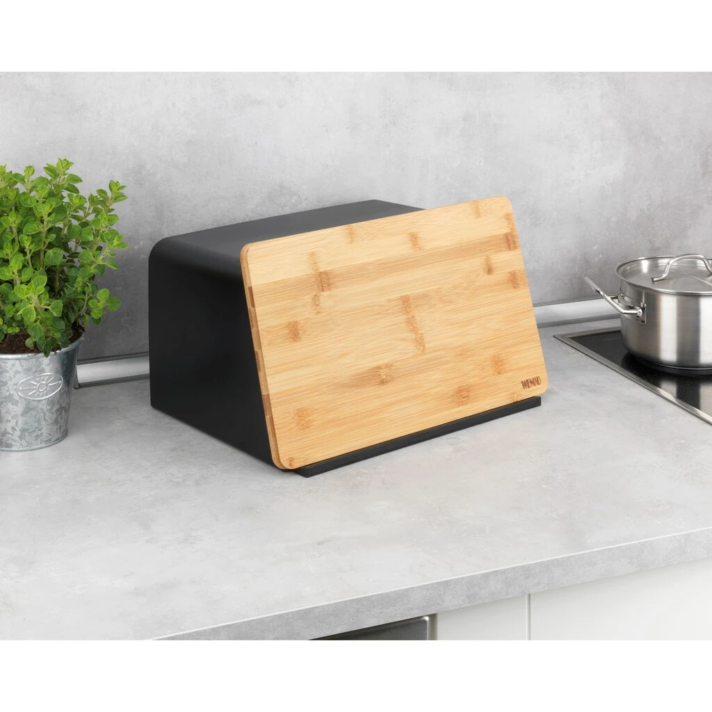 Mit der Brotbox mit Bambusbrett Kubo bietet WENKO eine dekorative Brotaufbewahrung, die in Sachen Design u. Funktionalität absolut überzeugt. Das 3 in 1 Konstrukt hält Brot und Backwaren lange frisch, ist vielseitig einsetzbar und sieht dabei auch noch höchst elegant aus. Egal, ob zum Frühstück, als Zwischenmahlzeit oder zum Abendbrot – so eine Brotzeit kommt nie aus der Mode. Verübeln kann man es dem traditionellen Klassiker auch nicht, denn auf vielfältige Weise aufbereitet, trifft eine Brot-Mahlzeit absolut jeden Geschmack! Der aus hochwertigem ABS-Kunststoff gefertigte Brotkasten mit extravaganter Form wird zum absoluten Blickfang in Ihrer Küche! Das robuste Material ist pflegeleicht u. eignet sich daher über alle Maßen für den Einsatz in der Küche. Im inneren überzeugt die geräumige Aufbewahrungsbox mit zwei Ebenen ebenfalls. Brot, Knäckebrot, Brötchen & Co. finden einen hier einen sicheren Platz und bleiben lange frisch, denn die Belüftungslöcher auf der Rückseite des Kastens sorgen für eine optimale Luftzirkulation. Das Bambusbrett verschließt den Brotkorb vorne, schützt vor Blicken und gewährleistet eine dunkle Lagerung Ihrer Backwaren. Das Brett aus Bambus lässt sich aber auch auf andere Weise gewinnbringend nutzen. Als Schneidebrett schneiden Sie hier komfortabel Brot und Baguette, als Servierplatte für Aufschnitt eingesetzt eignet sich der Haushaltshelfer ebenfalls. Die Kombination aus schwarzem Kasten und Bambusbrett in Natur überzeugt auch optisch. Der formschöne Behälter schmiegt sich stilvoll auf Ihre Küchenarbeitsplatte und fügt sich bestens in Ihr bestehendes Interior ein. Gefertigt ist das Schneidebrett aus hochwertigem Bambus, welcher hart und widerstandsfähig ist. Auch unter ökologischen Aspekten bietet das Material Vorteile: Bambus ist ein schnell nachwachsender Rohstoff und liegt dank seiner Natürlichkeit absolut im Trend. Das Beste: Vor dem Schneidebrett lässt sich optimal ein Tablet oder ein Smartphone anlehnen.