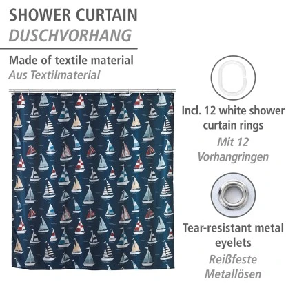 Der Wenko Duschvorhang Regatta Polyester 180 cm x 200 cm sorgt für das reinste Duschvergnügen. Duschabtrennungen sollen das Bad vor Duschwasser schützen und Sie können das Bad optisch enorm bereichern. Ein textiler Duschvorhang ist aufgrund seines Materials der perfekte Begleiter, um mit Feuchtigkeit, Hautkontakt und heißer Luft beim Duschen zurechtzukommen. Der langlebige Vorhang Regatta trocknet sehr schnell und fühlt sich bei Berührung angenehm an. Zusätzlich ist der schöne und effektive Helfer EU-patentiert. Auch in Sachen Optik muss sich der attraktive Vorhang Regatta nicht verstecken. Das mehrfarbige Design mit den vielen kleinen Segelbooten versprüht maritimes Feeling im Badezimmer. Mit einer Breite von 180 cm eignet sich der ausgefallene Duschvorhang sowohl für Dusche als auch Badewanne. Der hochwertig verarbeitete Duschvorhang ist aus besonders haltbarem Polyester hergestellt. Durch die Oberflächen-Veredelung erhält das Material einen wasserabweisenden Effekt, der zusätzlich für ein einfaches Abperlen von Feuchtigkeit und Wasserspritzer sorgt. Die Feuchtigkeit sammelt sich nicht mehr in den Vorhangfalten. Die Duschvorhänge sind deswegen besonders lange haltbar und trocknen nachweislich schneller. Er ist pflegeleicht und bei 30 °C waschbar. Der obere Saum ist mit einer verstärkten Lochleiste und rostfreien Metallösen versehen. Am unteren Ende ist ein umweltfreundliches Gewichtsband aus Gummi (statt Bleikette) formgebend. Im Lieferumfang sind 12 weiße Duschvorhangringe aus Kunststoff enthalten.