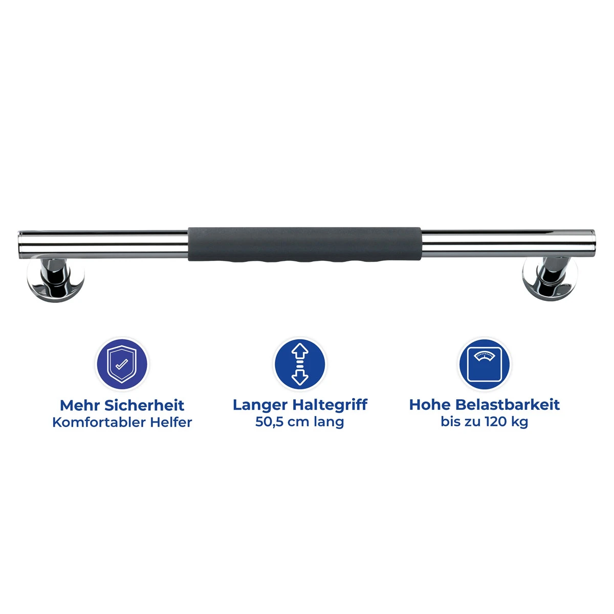 Die Secura-Produkte von WENKO erleichtern den Alltag und geben auch bewegungseingeschränkten Menschen die Möglichkeit, die täglichen Herausforderungen bei der Körperhygiene eigenständig zu bewältigen. Bedacht auf Sicherheit und Komfort – entdecken Sie unser breit gefächertes Secura-Sortiment. Unsere Badgriffe sind ideal als Gleichgewichtsstütze beim Duschen, Baden oder am WC und verleihen in jeder Situation einen festen Halt. Probleme beim Aufstehen und Hinsetzen gehören der Vergangenheit an:Der 50,5 cm lange Wandhaltegriff Secura lässt sich an der Badezimmerwand frei wählbar platzieren. Mit dem zuverlässigen Bad-Sicherheitsgriff von WENKO kommt man ganz einfach und ohne fremde Hilfe in die Badewanne hinein und wieder heraus.Auch neben dem WC macht sich der komfortable Wandhaltegriff stets nützlich. Der Haltegriff kann mit maximal 120 kg belastet werden.Der TÜV Bauart geprüfte Haltegriff ist aus schwerem, hochwertigem Edelstahl gefertigt kombiniert mit ergonomischen Soft-Touch-Griffflächen in angesagtem Schwarz. Im Lieferumfang sind Schrauben und Dübel zur Befestigung enthalten.