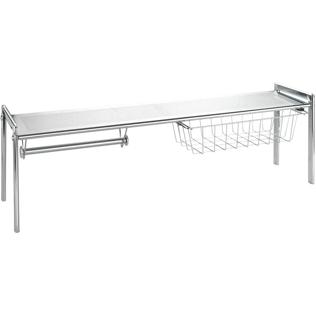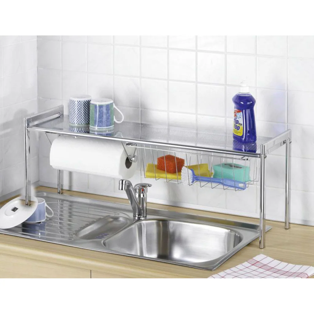 Das praktische Spülbeckenregal »Exquisit« von WENKO schafft mehr Stauraum in Ihrer Küche, ganz ohne Umbau-Maßnahmen. Ungenutzter Platz hinter der Spüle wird ganz einfach nutzbar gemacht. Es bietet beim Einsatz, z.B. am Spülbecken eine zusätzliche Ablage für alle Spülutensilien. Im herausziehbaren Ablagekorb können Schwämme, Lappen und Bürsten trocken aufbewahrt werden. Zudem ist am Regal eine separate Halterung für Küchenrollen angebracht. Maße (B x H x T): 93 x 30 x 21,5 cm.