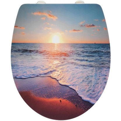 Der exklusive Wenko Premium WC- Sitz Sunset bringt eine romantische Sonnenuntergangs-Stimmung in jedes Bad und Gäste-WC. Holen Sie sich die Abendstimmung am Meer direkt in das heimische Badezimmer. Die hochglänzende Deckeloberfläche bedruckt mit einem beeindruckenden Sunset-Motiv verfügt nicht nur über einen angenehmen Sitzkomfort, sondern ist mit praktischen Zusatzfunktionen ausgestattet.