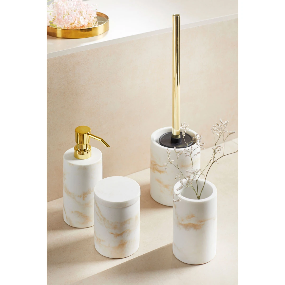 Die Bad-Accessoire Serie Odos von Wenko mit zarter Marmor Struktur in Weiß und Gold setzt magische Akzente in Ihrem Badezimmer & Gäste-WC und liegt dabei absolut im Trend.Der Zahnbecher Odos hält Zahnbürsten und Zahnpasta stets dekorativ griffbereit. Perfekte Dosierung von Flüssigseife oder Lotion ist mit dem nachfüllbaren Flüssigseifen-Spender möglich. Durch leichten Druck auf den goldenen Dosierknopf wird die gewünschte Menge Seife bzw. Lotion herausgepumpt. Auch als Spülmittelspender oder Handseifenspender in der Küche ist er einsetzbar. Die Accessoires sind aus Polyresin gefertigt. Dieser Kunststoff zeichnet sich durch Langlebigkeit, Stabilität und eine authentische Haptik aus. Da uns Langlebigkeit & Nachhaltigkeit am Herzen liegen, verwenden wir qualitativ ausgesuchte Materialien.Aus der Serie Odos sind weitere Accessoires in modernem Marmor-Design für Ihr Badezimmer erhältlich.