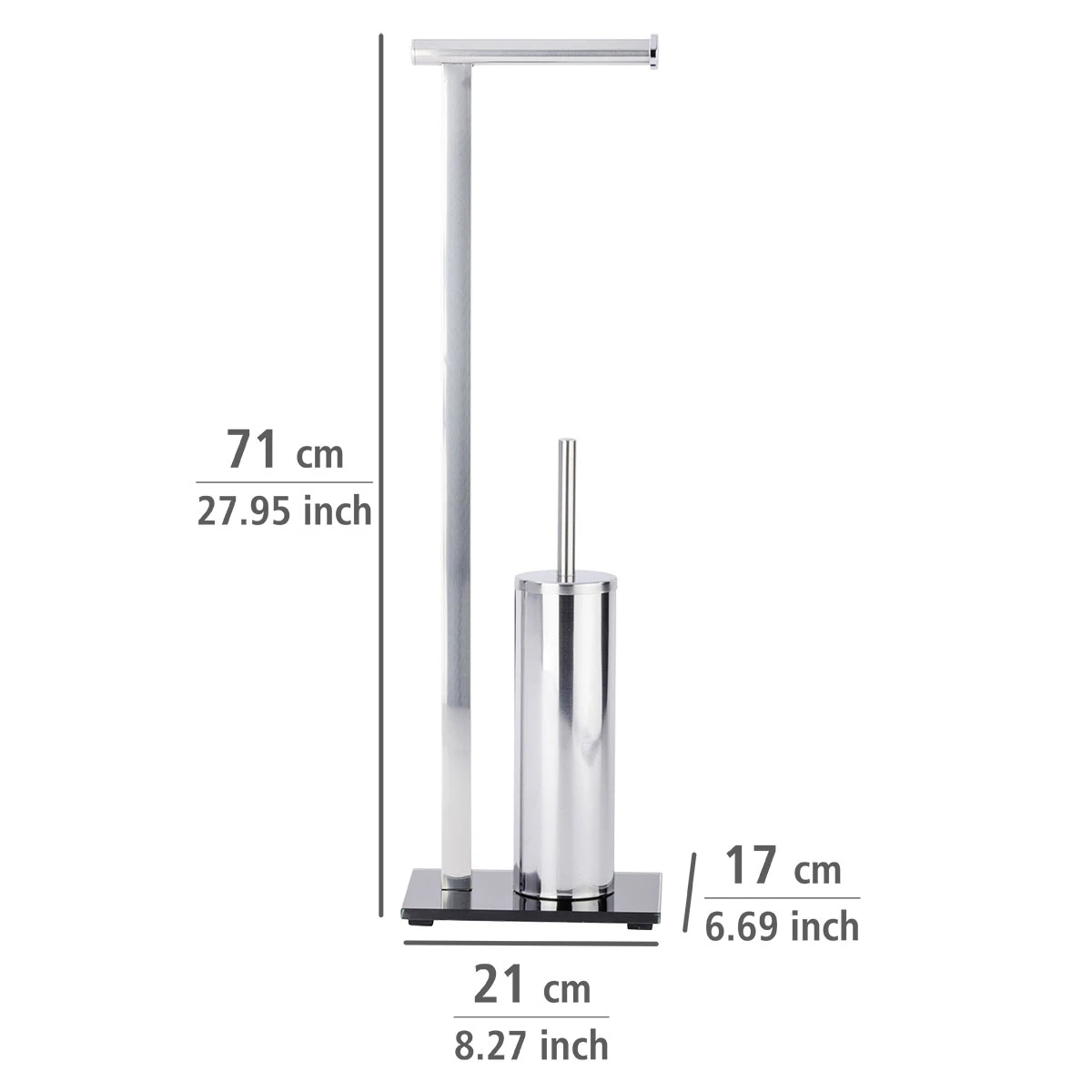 Die moderne Bad-Serie Lava ist aus hochwertigem, rostfreiem Edelstahl gefertigt und präsentiert ein klares Konzept mit einer trendigen Kombination aus Rund- und Vierkantrohr.Die Stand WC-Garnitur Lava ist eine 2 in 1 Kombination aus Toilettenpapierrollen- und geschlossenem WC-Bürstenhalter. Mit diesem praktischen Helfer werden Papier und Bürste stets griffbereit und dekorativ aufbewahrt.Die schöne, schwarze Bodenplatte aus gehärtetem Glas sorgt für stabilen Halt. Im Lieferumfang ist eine WC-Bürste mit auswechselbarem, schwarzem Bürstenkopf von Ø 7,5 cm enthalten. Mit dieser praktischen WC-Bürste kann das WC gründlich gereinigt werden. Die Bürste gewährleistet durch ihre strapazier- und anpassungsfähigen Borsten eine zuverlässige Nutzung.
