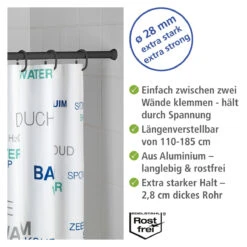 Schnelles und einfaches Anbringen des Dusch- oder Badewannenvorhangs – die Teleskop-Duschstange löst flexibel das Problem von fehlenden Aufhängemöglichkeiten für Vorhänge insbesondere im Badezimmer. Die Aufhangstange im attraktiven Schwarz aus Aluminium ist variabel von 110 bis 185 cm Breite einstellbar und einfach zwischen zwei Wände zu klemmen. Der Rohrdurchmesser von 2 cm passt für jeden Vorhang und sorgt für Halt.