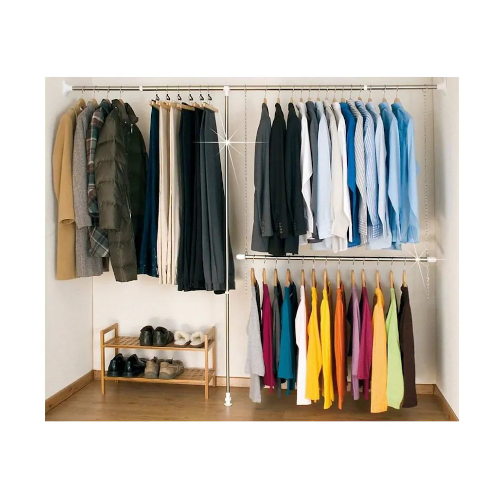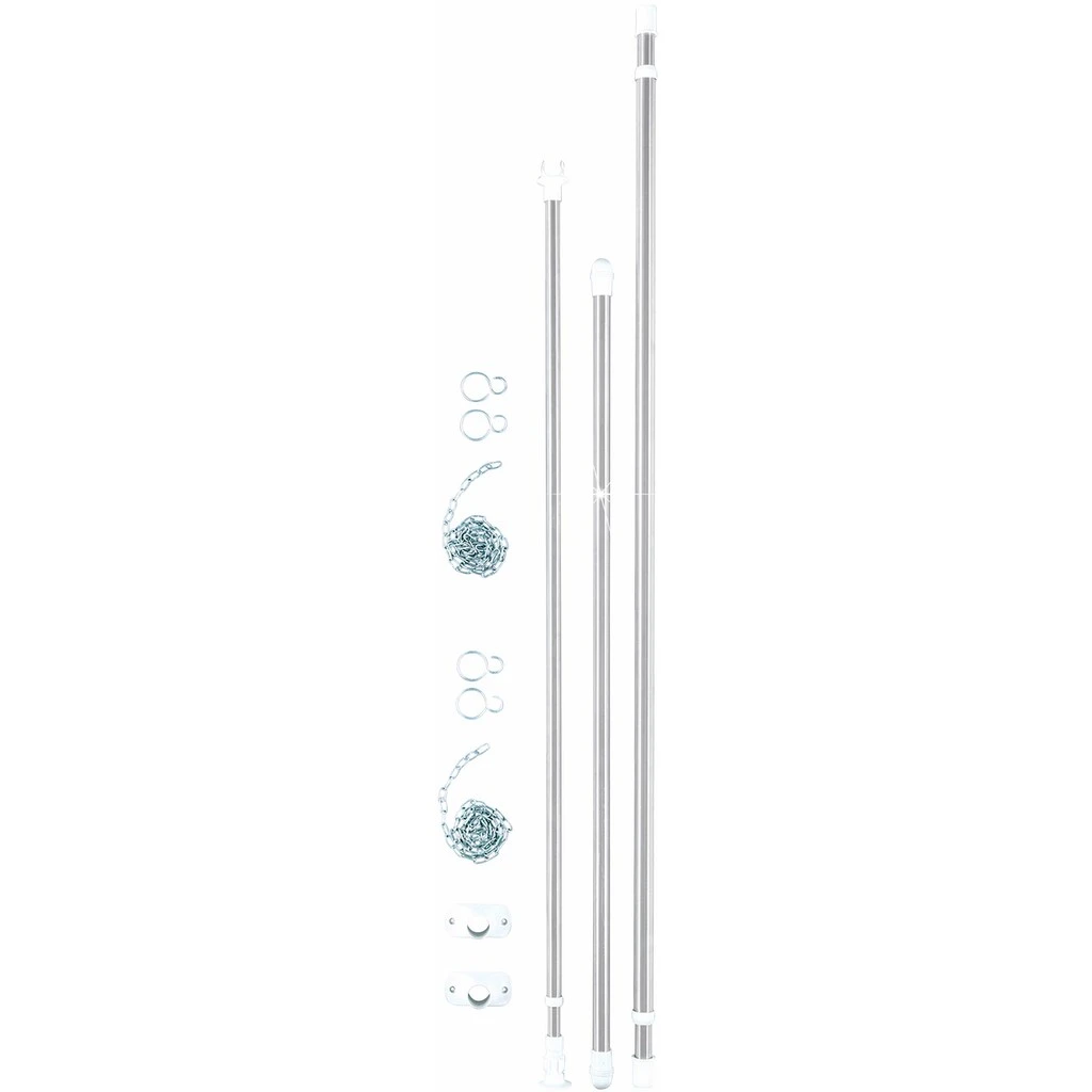 Set: Teleskop-Garderobe, Wenko (3tlg.). Aus rostfreiem Edelstahl, bietet Ihnen viel Platz für Kleider, Mäntel, Oberteile, Hosen, Blusen oder Hemden. Es ist in der Breite über einen Teleskopstil von 150-250 cm ausziehbar und wird zwischen zwei Wände oder direkt in einem Schrank-Korpus montiert. Eine weitere 122 cm breite Garderobenstange kann durch verstellbare Ketten auf die gewünschte Höhe abgehängt werden und schafft zusätzlichen Platz. Eine zusätzliche Stützstange (von 129 bis 202 cm verstellbar) sorgt für eine hohe Tragkraft von bis zu 200 kg.