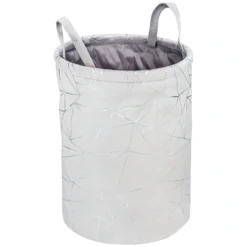 Mit zwei handlichen Griffen versehen, können Sie den schönen Wäschekorb mühelos von einem Ort zum anderen transportieren. Die gesammelte Schmutzwäsche kann an den herunterhängenden Henkeln bequem zur Waschmaschine gebracht werden. Die silbernen Linien in geometrischer Anordnung harmonisieren die Wäschetonne auf entzückende Weise. Das macht sie zu einem Hingucker in allen Räumen, – egal ob Badezimmer, Schlafzimmer oder Flur. Der dekorative runde Wäschekorb hat eine Maße von Ø 40 x 55 cm und ein großzügiges Volumen von 69 Litern. Er lässt sich dekorativ in kleinen Nischen platzieren und ist somit der ideale Begleiter für kleine Bäder.