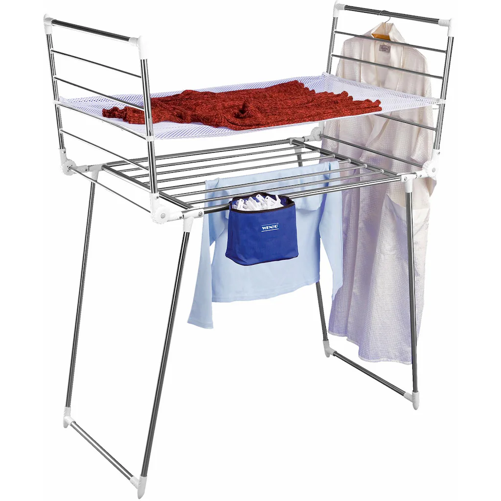 Flügel-Wäschetrockner, Wenko, »HERKULES«. 16 breite Stangen (Ø 9,5 mm) vermeiden unansehliche Abdrücke auf Ihren T-Shirts, Handtüchern, etc. Ausklappbare Flügel, stufenweise höhenverstellbar – so trocknen auch längere Textilien optimal. Platzsparend zusammenklappbar. Trockenlänge 13 Meter. Inklusive: 1 Pullovertrockner 102 x 64 cm, 24 Wäscheklammern, 1 Zubehörtasche.