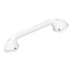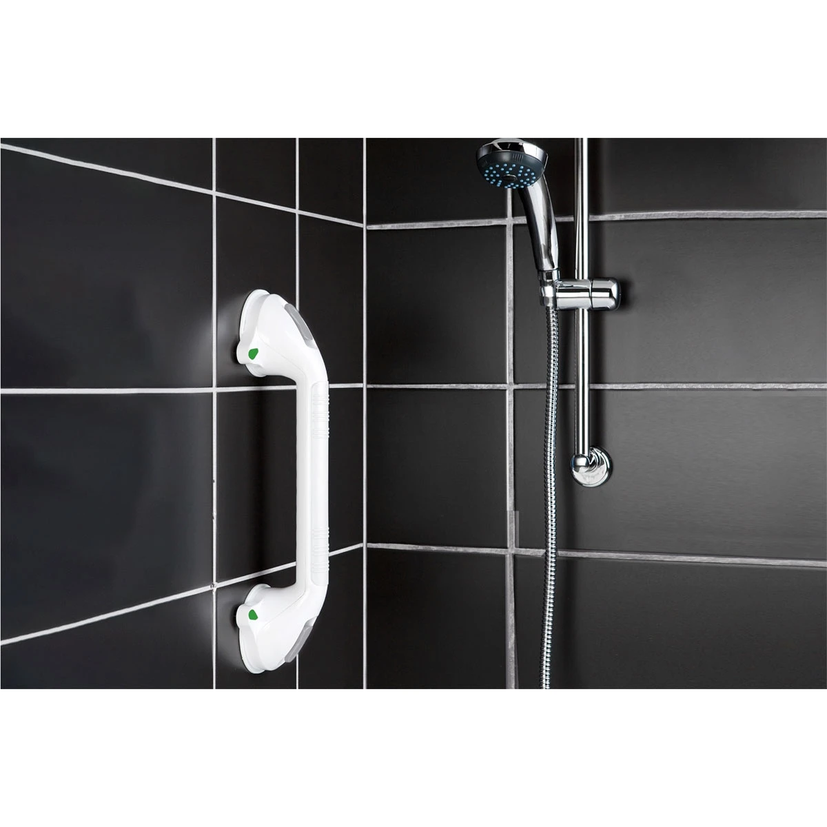 Sicherer Halt im Badezimmer: Der Wandgriff Secura dient im Waschbecken- oder WC-Bereich als zusätzlicher Haltegriff.Der Wandgriff aus hochwertigem und stabilem Kunststoff ist durch Aufdrücken des Saugtellers und Umlegen des Hebels ganz einfach und unkompliziert anzubringen oder zu entfernen.Die spezielle Anzeige für die Saugnäpfe zeigt an, ob der Griff sicher sitzt, oder ob die Position geändert werden muss. Mit Ampelanzeige für den Saughalt: OK=Grün, Achtung, locker=Rot. Somit ist ein hoher Sicherheitsstandard gewährleistet. Dieser Griff hält auf nur auf glatten, luftundurchlässigen Oberflächen und ist nicht für strukturierten Untergrund geeignet.