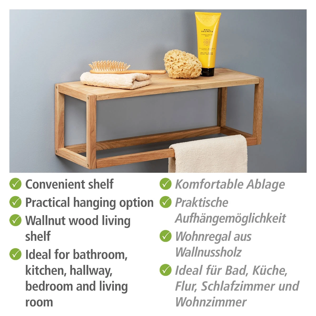 Oh wie schön ist Ferrara! Das charmante Wandregal Ferrara von WENKO überzeugt in geradlinigem Design und einer ansprechenden Optik. Die komfortable Ablage, kombiniert mit einer praktischen Aufhängung, machen das Behaglichkeit ausstrahlende Möbelstück zu einem unerlässlichen Wohn-Accessoire.Das offen gestaltete Wandboard aus hochwertigem Wallnussholz ist vielseitig in Ihrem zu Hause einsetzbar und bietet mit seiner cleveren Ablage viel Platz für Bücher, Küchenutensilien, Accessoires und Dekoration. Egal, wo Sie das stilvolle Wohnregal platzieren, ob im Flur, Schlafzimmer, in der Küche oder im Wohnzimmer – das nützliche Allzweckregal macht immer eine gute Figur.Der elegante Holzrahmen fungiert zeitgleich als Aufhängung. Badetücher und Handtücher finden hier einen attraktiven Platz in greifbarer Nähe. Auch Schals und Tücher lassen sich in Form einer Wandgarderobe an dem Holzregal aufhängen. Sie brauchen einen Platz zum Aufhängen ihrer Kleidung? – Kein Problem! Ihre Kleiderbügel hält das Wohnregal ebenfalls sicher bereit!Zuhause vermittelt ein Gefühl von Sicherheit & Geborgenheit. Insbesondere nach einem stressigen Tag dient das eigene Heim als Rückzugsort, zur Erholung und Entspannung. Umso schöner wenn dann alles seine Ordnung hat! Geben Sie auch ihren liebsten Stücken einen gut aufbewahrten, dekorativen Platz mit dem Wandregal Ferrara von WENKO!