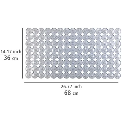 Für mehr Sicherheit und Komfort in der Badewanne sorgt die praktische Wenko Wanneneinlage Belem 67,5 cm x 36 cm in Transparent. Die rechteckige Wanneneinlage zeichnet eine Kombination aus ansprechender Optik und funktionaler Beschaffenheit aus, auf diese Weise verleiht sie Ihrer Wanne auf elegante Art den letzten Schliff. Das Design der Antirutschmatte überzeugt dank geometrisch angeordneten Kreisen, die ein in sich stimmiges Bild ergeben. In dezentem Transparent gehalten, fügt sich die Einlage bestens in Ihr bestehendes Badezimmer-Interior ein. Die dekorative Matte in 67,5 cm x 36 cm verfügt über eine hautsympathische, angenehme Oberfläche mit Rutschstopp-Struktur, welche zuverlässig das Ausrutschen in der Badewanne verhindert und für einen sicheren Stand sorgt. Die Sicherheitseinlage aus hochwertig verarbeitetem Kunststoff eignet sich für gängige Badewannen. Die Oberfläche moderner Sanitärkeramik ist hart und glatt, in Verbindung mit Wasser und Seife kann sie sich daher schnell in eine gefährliche Rutschbahn verwandeln. Dem wirkt die schicke Anti-Rutschmatte entgegen: Die Saugnäpfe an der Unterseite bieten Haftung und verhindern das Verrutschen. Wichtig hierbei ist, dass der Untergrund eben, sauber und fettfrei ist. Für einen sicheren Einsatz, die Saugnäpfe vor Gebrauch fest andrücken.